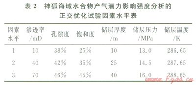 水合物藏產(chǎn)氣潛力的地質(zhì)評(píng)價(jià)參數(shù)是指對(duì)水合物產(chǎn)氣效率產(chǎn)生影響的沉積地質(zhì)要素,地質(zhì)評(píng)價(jià)參數(shù)的正確選擇是產(chǎn)氣潛力評(píng)價(jià)的關(guān)鍵。首先,通過(guò)綜合特定海域水合物區(qū)的地質(zhì)、地球物理、鉆探數(shù)據(jù)等資料,研究巖性、巖相展布規(guī)律、水合物的賦存狀態(tài)和地質(zhì)條件、水合物產(chǎn)m特征和儲(chǔ)層類型,定性和定量分析影響水合物分解和產(chǎn)氣潛力的各項(xiàng)要素,如巖性、溫壓條件、沉積體孔隙度、水合物飽和度、滲透率、儲(chǔ)層厚度、孔隙水鹽度等;然后,數(shù)值分析地質(zhì)參數(shù)對(duì)水合物產(chǎn)能的影響強(qiáng)度和敏感性,利用正交優(yōu)化試驗(yàn)方法對(duì)地質(zhì)參數(shù)的影響強(qiáng)度進(jìn)行排序,如表l中南海北部神狐海域3個(gè)站位上的水合物產(chǎn)出特征的地質(zhì)參數(shù),可構(gòu)建如表2所示的正交優(yōu)化試驗(yàn)因素水平表,通過(guò)選用合適的正交表即可實(shí)現(xiàn)對(duì)地質(zhì)參數(shù)的優(yōu)化和排序;選擇對(duì)水合物藏產(chǎn)氣潛力影響較為顯著的地質(zhì)參數(shù),舍棄影響較小、敏感性差的地質(zhì)參數(shù)。