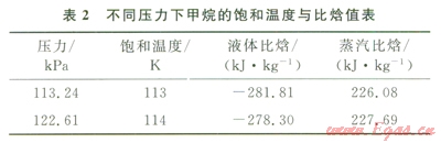由于LNG的主要成分為甲烷,所以采用純甲烷的物性參數(shù)來確定hL和hBt[14]。而國內(nèi)常壓全容式混凝土頂儲(chǔ)罐的設(shè)計(jì)壓力一般為-0.50~29.O0kPa(表壓),冷卻時(shí)的壓力通??刂圃?span lang="EN-US">111.32~l21.32kPa(絕對(duì)壓力)。表2列出了不同壓力下甲烷的飽和溫度與比焓值,從表2不難看出壓力在l13.24~122.6lkPa時(shí),蒸汽比焓的變化較小,所以取其對(duì)應(yīng)液體比焓的平均值作為hL值,即hL為-280.06kJ/kg。