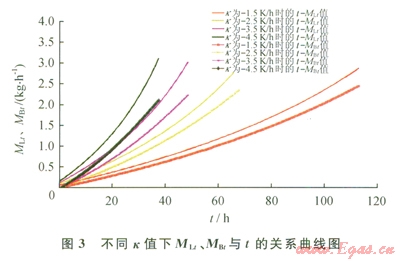 由于冷卻速度不同會(huì)導(dǎo)致瞬時(shí)進(jìn)入儲(chǔ)罐的LNG流量和冷卻所需的LNG需求量不同,同時(shí)導(dǎo)致瞬時(shí)排出儲(chǔ)罐的BOG流量和冷卻過程總共排出的BOG量也不同。當(dāng)儲(chǔ)罐壓力為111kPa,環(huán)境溫度為293K,儲(chǔ)罐冷卻初始溫度為293K,冷卻速度分別為-1.5K/h、-2.5 K/h、-3.5K/h、-4.5K/h時(shí),冷卻過程中冷卻時(shí)間(t)與LNG流量(MLt)、排放BOG流量(MBt)間的關(guān)系如圖3所示,冷卻過程中儲(chǔ)罐溫度(Tt)與LNG流量(MLt)、排放BOG流量(MBt)間的關(guān)系如圖4所示。