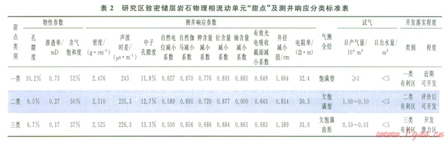 巖石物理相流動單元“甜點(diǎn)”研究在致密儲層開發(fā)中具有十分重要意義,一般致密氣層、差氣層主要富集于一、二類流動單元內(nèi),氣顯示層則賦存于分隔體中。研究分隔屏障的主要問題是要在剖面上將其劃分出來,即對相應(yīng)儲集體進(jìn)行細(xì)分巖石物理相流動單元,并盡可能描述出最小一級分隔體。為此,在該區(qū)致密儲層含氣有利區(qū)分布及非均質(zhì)特征研究中,精細(xì)地表征儲層性質(zhì)、分布及其對天然氣滲流的影響,結(jié)合巖石物理相流動單元“甜點(diǎn)”儲層特征與測井響應(yīng)(含氣測全烴)特征,把該區(qū)巖石物理相流動單元“甜點(diǎn)”劃分為一、二、三類,即按滲流、儲集和含氣“甜點(diǎn)”控制能力及測井響應(yīng)特征分為近期可開發(fā)(一類)、評價后可開發(fā)(二類)及勘探開發(fā)潛力區(qū)(三類)等三類含氣有利區(qū)(表2)。