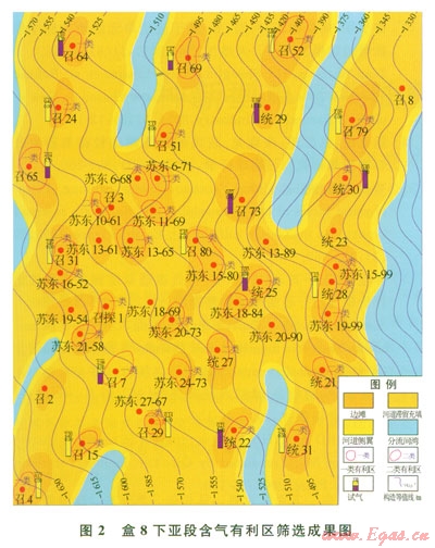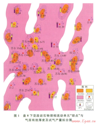2)選用反映致密儲層滲流特征的流動層帶指標(biāo)、儲能參數(shù)、單滲砂層能量厚度、氣層有效厚度、含氣層厚度、滲透率、孔隙度、含氣飽和度等多種參數(shù),利用灰色理論從不同角度對儲層滲流、儲集及含氣特征進(jìn)行全面分析,分別據(jù)一、二類巖石物理相流動單元“甜點(diǎn)”圈定出近期可開發(fā)或評價后可開發(fā)的含氣有利區(qū)97個,集中地反映出研究區(qū)致密儲層含氣有利區(qū)的分布規(guī)律、延伸方向及非均質(zhì)分布特征。