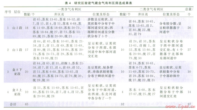 通過上述山2段、山1段、盒8下亞段、盒8上亞段主要含氣目的層段含氣有利區(qū)分析預(yù)測,分別層位篩選并劃分出一類、二類含氣有利區(qū)氣藏97個,其中在山2段篩選圈定26個,山1段圈定27個,盒8下亞段圈定30個,盒8上亞段圈定14個(表4)。這些含氣有利區(qū)處于十分有利的沉積成巖儲集相帶及其含氣圈閉和含氣富集條件下,測井解釋具有明顯較好的儲集、滲流和含氣特征,測井綜合評價為一、二類巖石物理相流動單元“甜點(diǎn)”,試氣具有工業(yè)氣流或較高產(chǎn)量,為該區(qū)致密氣藏儲層增儲上產(chǎn)提供有利目標(biāo)和井區(qū)(圖1、2)。