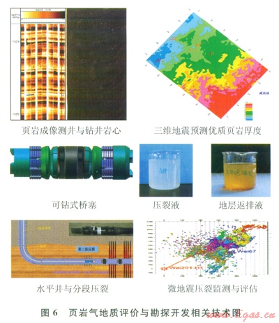 在頁巖氣勘探開發(fā)前,中國已在沁水盆地、鄂爾多斯盆地、四川盆地成功實現(xiàn)了煤層氣和致密砂巖氣的規(guī)?;I(yè)生產(chǎn),基本明確了非常規(guī)天然氣的地質(zhì)特征、富集規(guī)律,基本形成了一套有效的地質(zhì)評價、富集區(qū)選擇方法,初步摸索出了一套有效的勘探開發(fā)技術(shù)。在頁巖氣勘探開發(fā)進程中,中國充分借鑒、學習北美的成熟技術(shù)[10],充分利用中國在常規(guī)及其他非常規(guī)油氣勘探開發(fā)中形成的先進有效技術(shù),在致力于頁巖氣地質(zhì)理論研究的同時,初步探索形成了多項頁巖氣勘探開發(fā)適用技術(shù)(圖6),包括頁巖氣形成與富集特征研究方法、頁巖氣地質(zhì)評價與選區(qū)方法、頁巖氣資源評價方法、頁巖氣測井識別與處理解釋技術(shù)、地震采集處理與儲層識別預(yù)測技術(shù)、水平井鉆完井技術(shù)、水平井分段體積壓裂工藝技術(shù)、頁巖儲層改造配套工具、儲層改造低摩阻與速溶滑溜水體系、多種裂縫監(jiān)測診斷評估技術(shù)等。