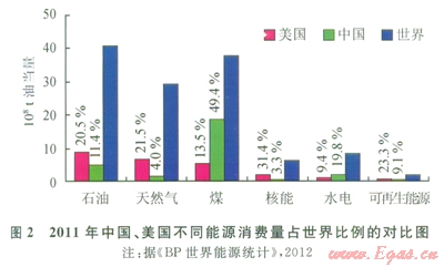 中國社會經(jīng)濟持續(xù)高速發(fā)展,能源需求量屢創(chuàng)新高。2011年中國一次能源生產(chǎn)總量為2 446.1×106t油當量,一次能源消費量為2613.2×106t油當量[3]。2000—2011年世界平均能源消費量增長為31.2%,而中國能源消費量則增長了158.6%,占世界總能源消費增長量的21.3%,超過了美國等發(fā)達國家(圖3)。但中國能源資源量仍非常低,尤其是人均油氣資源量僅占世界平均水平的6%。中國1993年首次成為石油凈進口國,2006年天然氣也跨人凈進口國之列[5]。中國石油對外依存度由l993年的l.2%飆升到2011年的58%,天然氣對外依存度由2006年的0.8%迅速攀升至2011年的23%,成為全球能源市場中最重要的進口國。在天然氣需求中,近年來(2006 2011年)盡管中國的天然氣產(chǎn)量每年平均增長l3%以上,成為全球天然氣產(chǎn)量增長最快的國家之一,但總量還是非常少的。2011年中國天然氣產(chǎn)量為1025×108m3,天然氣消費量同期年均增長量超過18%,2011年中國天然氣消費量達1307×108m3。據(jù)預(yù)測,到2020年中國天然氣年均消費量仍將以19%的復(fù)合年增長率遞增,在中國能源結(jié)構(gòu)中的比例將由2011年的5%提高到l0%~l 5%,而屆時中國天然氣產(chǎn)量僅為2000×108m3左右。
