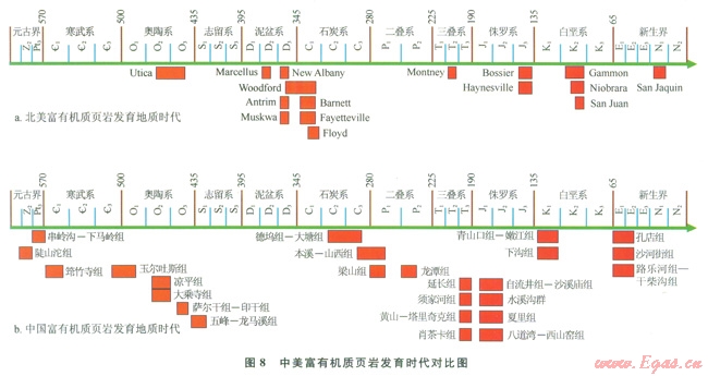 在地質(zhì)特征上,作為有勘探開發(fā)遠景的含氣頁巖儲層既要有產(chǎn)氣潛力大的物質(zhì)基礎(chǔ)——高質(zhì)量儲層(RQ),也要是能進行有效壓裂的目標——良好的鉆完井地層(CQ)。有機質(zhì)含量高的富含有機質(zhì)頁巖是在特殊條件下形成的[2],這種特殊的條件使得所有頁巖氣儲層都有其獨特性(圖7) [6-7],即便是同一套頁巖儲層的地質(zhì)特征在縱橫向上也往往會有非常明顯的變化。每一頁巖儲層要實現(xiàn)工業(yè)化規(guī)模開發(fā)都需要花費一定的時間對其地質(zhì)特征進行認識,摸索適應(yīng)的工程技術(shù)。從對比研究的結(jié)果可知,與北美地臺頁巖氣儲層相比,中國頁巖氣形成與富集地質(zhì)條件非常復(fù)雜,除頁巖沉積總面積可能相當外,其他條件都相差較遠。美國產(chǎn)氣頁巖主要是海相沉積,而中國除海相頁巖外,還有較為發(fā)育的海陸過渡相和陸相頁巖(圖8)。美國頁巖氣主要產(chǎn)白上古生界一中生界,中國白元古界到新近系都有頁巖發(fā)育[1]。美國頁巖熱(R。)為1.0%~3.5%,處在生氣高峰期,中國海相頁巖R。為2.3%~5.1%,為高——過成熟熱裂解成氣階段,陸相頁巖R。為0.4%~l.2%,處于低熟一成熟階段,以生油為主,局部生氣。北美地臺構(gòu)造穩(wěn)定,斷裂少,頁巖自沉積、成巖、成氣以來,除有一定抬升外,很少有大的構(gòu)造改造,中國構(gòu)造背景總體處在活動性較強的區(qū)域,斷裂發(fā)育,大部分頁巖都經(jīng)歷了強烈的后期多次改造,南方海相頁巖大面積出露。另外,從圖9中可明顯看出,中國頁巖儲層楊氏模量較低、泊松比高,巖石脆性指數(shù)低于美國頁巖儲層,可壓性差。