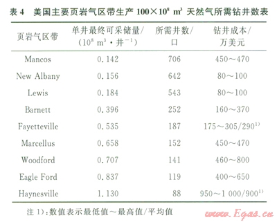 頁巖氣井生產(chǎn)具有單井產(chǎn)量低、遞減快等顯著特征,需要大量鉆井才能實現(xiàn)頁巖氣規(guī)模產(chǎn)量與穩(wěn)產(chǎn)(表4)。因此,頁巖氣勘探開發(fā)投資巨大,成本高,一般企業(yè)承擔不了如此巨大的投入風險。美國的頁巖氣勘探開發(fā)是在較為完善的天然氣管網(wǎng)和發(fā)育的消費市場基礎(chǔ)上,不斷改善技術(shù)、優(yōu)化作業(yè)流程、降低成本,才使其勘探開發(fā)成本明顯偏高,短期內(nèi)根本無利可圖。四川盆地頁巖氣勘探開發(fā)試驗區(qū)統(tǒng)計結(jié)果表明,目前該試驗區(qū)頁巖氣水平井所需費用均超過4000萬元(人民幣),有的甚至達到7000萬元(人民幣),單井頁巖氣產(chǎn)量僅1.0×104~15.0×104m3/a,單井可采儲量為0.2×108~0.5×108m3,其虧損明顯。況且中國頁巖的賦存地質(zhì)條件比美國復(fù)雜,頁巖氣勘探開發(fā)成本本身就可能會高于美國。