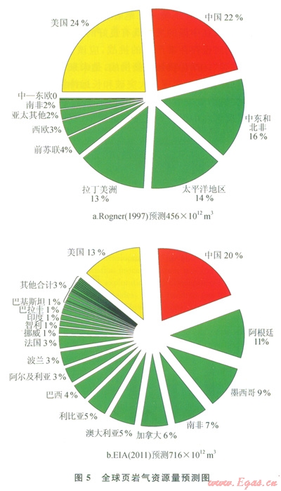 頁巖氣在中國雖顯些許陌生,但目前在中國陸上已發(fā)現(xiàn)從前寒武紀到新生代均有豐富的富有機質(zhì)頁巖發(fā)育(圖4)[5],初步預(yù)測中國具有豐富的頁巖氣資源量。美國學者(Rogner,1997) [6-7]、美國能源信息署(EIA,2011) [8]預(yù)測全球頁巖氣資源量為456×1012~716×1012m3 (圖4),接近或超過了全球常規(guī)天然氣資源量(471×1012m3)。其中所預(yù)測的中國頁巖氣資源量為l00×1012~l44.4×1012m3,占世界頁巖氣總資源量的20%左右(圖5)。2005年以來,中國機構(gòu)或?qū)W者借鑒北美成功經(jīng)驗,加快頁巖氣地質(zhì)認識,強化頁巖氣勘探開發(fā)技術(shù)攻關(guān),通過廣泛開展中國頁巖氣地質(zhì)評價與典型區(qū)塊的勘探開發(fā)先導試驗,在四川、鄂爾多斯等盆地和重慶黔江、湖南漣源等地區(qū)的頁巖氣勘探開發(fā)中相繼取得突破,證實了中國頁巖氣(資源)的廣泛存在,具良好的勘探開發(fā)前景。利用露頭地質(zhì)調(diào)查、探井及實驗測試等取得的實際數(shù)據(jù),預(yù)測中國頁巖氣地質(zhì)資源量為57×102~224×1012m3,技術(shù)可采資源量為10.3×1012~47×1012m3 (表1) [5]。2012年中國政府已依據(jù)中國豐富的頁巖氣資源量、勘探開發(fā)先導試驗的可喜成果,制定了雄心勃勃的《中國頁巖氣“十二五”發(fā)展規(guī)劃》:2015年中國頁巖氣產(chǎn)量達到65×108m3,2020年力爭實現(xiàn)頁巖氣產(chǎn)量600×108~800×108m3[9]。