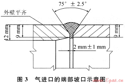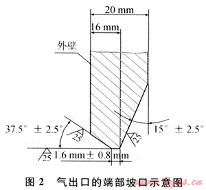 如前所述,在有效補強區(qū)域之外,接管的名義厚度可以取,為了方便與法蘭頸或外部管道對焊,需要對支管端部進行削邊處理,形成與外部連接的焊接坡口,削邊后的最小厚度不得小于強度要求的名義厚度。氣出口的端部坡口如圖2所示。氣進口的端部坡口如圖3所示。