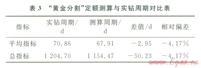 塔里木油田輪南區(qū)塊近4年共完鉆井18口,按照鉆井定額編制原則,選出17口與標(biāo)準(zhǔn)井井型類(lèi)似的基礎(chǔ)井,編制該區(qū)塊鉆井周期定額。定額測(cè)算周期與實(shí)際鉆井周期對(duì)比結(jié)果見(jiàn)表3??梢钥闯?,采用“黃金分割”測(cè)算出的平均單井鉆井周期比實(shí)際統(tǒng)計(jì)周期縮短2.95d,定額相對(duì)偏差為4.17%,滿足工程實(shí)踐需要。