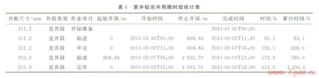 按石油鉆井技術(shù)經(jīng)濟(jì)指標(biāo)分類(lèi),將一口井鉆井用井眼尺寸劃分出不同井段(直井段、定向段和水平段),然后將鉆井過(guò)程分為開(kāi)鉆準(zhǔn)備、鉆進(jìn)、完井作業(yè)3個(gè)項(xiàng)目,其中鉆進(jìn)周期為該井眼尺寸自開(kāi)始鉆進(jìn)至鉆達(dá)設(shè)計(jì)固井深度或固井層位耗費(fèi)的時(shí)間,不包括堵漏、中途測(cè)試及取心等時(shí)間;完井周期為鉆達(dá)固井深度后進(jìn)行測(cè)井、下套管、注水泥及候凝等至下一次開(kāi)鉆前耗費(fèi)的時(shí)間,如果是鉆達(dá)設(shè)計(jì)地質(zhì)目的層,進(jìn)行完井作業(yè)就是完井時(shí)間。我們采用時(shí)間點(diǎn)原則分別對(duì)不同井眼尺寸的作業(yè)時(shí)間進(jìn)行統(tǒng)計(jì)(表1)。