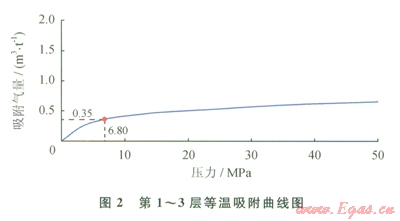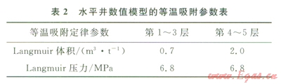 模型中吸附氣的解吸遵循Langmuir等溫吸附定律(表2),縱向上由頂?shù)降祝?span lang="EN-US">l~3層的等溫吸附曲線見圖2,第4~5層的等溫吸附曲線見圖3。模型的儲(chǔ)量為9.92×108m3,總含氣量為2.57m3/t,其中游離氣占總含氣量的58%,吸附氣占總含氣量的42%。