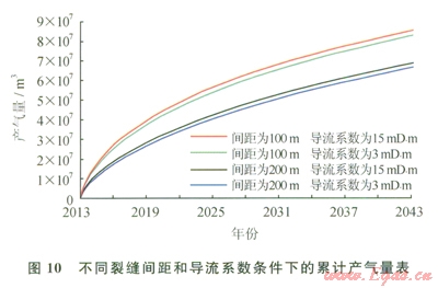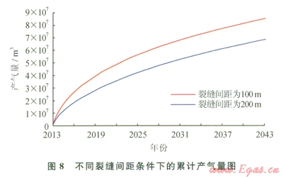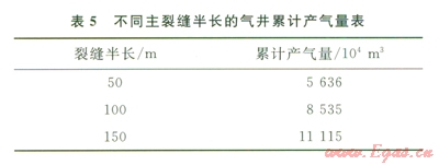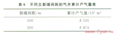 頁巖儲(chǔ)層的體積壓裂改造,通過多方向人丁縫裂溝通更多的天然裂縫,增加泄流面積。圖7和圖8分別模擬了不同裂縫半長(zhǎng)和不同裂縫間距條件下的單井模型累計(jì)產(chǎn)氣量的對(duì)比情況,表5和表6分別給出了具體的累計(jì)產(chǎn)氣量。結(jié)合圖7和表5、圖8和表6可以看出,當(dāng)體積壓裂形成的主裂縫較短或分段壓裂的級(jí)數(shù)較少時(shí),增加主裂縫的長(zhǎng)度和分段壓裂的級(jí)數(shù)都可以使累計(jì)產(chǎn)氣量顯著提高。但從模擬結(jié)果來看,當(dāng)裂縫半長(zhǎng)超過l00m后,再繼續(xù)增加裂縫的長(zhǎng)度,累計(jì)產(chǎn)氣量的增幅越來越小,同樣隨著分段壓裂級(jí)數(shù)的增加,累計(jì)產(chǎn)氣量的增幅也是越來越小的。