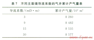 體積壓裂形成的裂縫體系是否具有經(jīng)濟(jì)效益,一個(gè)很重要的指標(biāo)是裂縫的導(dǎo)流能力,因此頁巖氣藏的開發(fā)不僅僅依靠復(fù)雜的裂縫網(wǎng)絡(luò)系統(tǒng),還需要裂縫有充分的導(dǎo)流能力。圖9展示了不同裂縫導(dǎo)流系數(shù)條件下的累計(jì)產(chǎn)氣量對(duì)比情況,表7中給出了具體的累計(jì)產(chǎn)氣量,從該圖9和表7中的數(shù)據(jù)可以看出主裂縫導(dǎo)流系數(shù)對(duì)模型的采出程度有較大影響,在其他條件都相同時(shí),提高壓裂形成主裂縫的導(dǎo)流能力,可明顯提高頁巖氣藏的采收率。這里需要指出的是,雖然增大裂縫的導(dǎo)流系數(shù),是提高采收率的途徑之一,但從圖9中可以看出,隨著導(dǎo)流系數(shù)的不斷增大,累計(jì)采氣量的增幅越來越小,對(duì)于本文中的數(shù)值模型,當(dāng)裂縫導(dǎo)流系數(shù)達(dá)到9mD·m后,進(jìn)一步增加裂縫的導(dǎo)流能力并不能顯著地提高氣藏的采出程度。