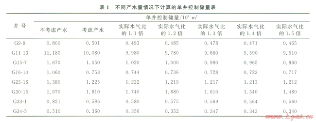 從上述圖表中可以看出:首先,不考慮產(chǎn)水情況的氣井控制儲量要高于產(chǎn)水的情況,出水對儲量的影響顯而易見;其次,考慮產(chǎn)水時,計(jì)算的儲量的降幅明顯加大。從計(jì)算結(jié)果可得出,考慮產(chǎn)水后,氣井控制量平均降低23.84%;產(chǎn)水情況下,越高,水量越大,相應(yīng)地氣井控制儲量也越低,水氣比每增大0.1倍時,氣井控制儲量將平均降低0.9%~l.2%。