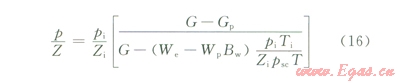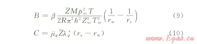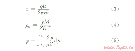 Kg為氣相滲透率,mD;Kw為水相滲透率,mD;lg為氣相啟動壓力梯度,atm/cm(1atm=98.0665kPa);lw為水相啟動壓力梯度,atm/cm;lgy,為原始狀態(tài)下的氣相啟動擬壓力梯度,atm2/(mPa·s·cm);rw 為井筒半徑,cm;re為氣井控制半徑,cm;mg為氣體的黏度,mPa·s;mw為地層水的黏度,mPa·s;`mg平均地層壓力下氣體的平均黏度,mPa·s;qwsc為標(biāo)況下產(chǎn)水量,cm3;qgsc為標(biāo)準(zhǔn)狀況下產(chǎn)氣量,cm3/S;h為氣層厚度,cm;b為描述孔隙介質(zhì)紊流影響的系數(shù),稱為速度系數(shù),cm-l;rg為氣體密度,g/cm3;rw為地層水密度,g/cm3;qgAOF為天然氣無阻流量,cm3/s;Pi為原始地層壓力,arm;Pe為某時刻地層壓力,atm;Pwf為井底壓力,atm;Psc為地面標(biāo)準(zhǔn)狀況下壓力,atm;ye為某時刻地層擬壓力,atm2/(mPa·s);ywf為井底擬壓力,atm2/(mPa·s);G為氣井控制儲量,cm3;Gp為氣井累計(jì)產(chǎn)氣量cm3;Zi為原始條件下氣體壓縮因子;`Z為平均地層壓力下氣體的壓縮因子;Zsc為地面標(biāo)準(zhǔn)狀況下氣體的壓縮因子;T為氣層溫度,K;R為氣體常數(shù),82.053atm·cm3/(mol·K);We為累計(jì)水侵量,cm3;Wp為累計(jì)產(chǎn)水量,cm3;Bg為氣相體積系數(shù);Bw為水相體積系數(shù)。