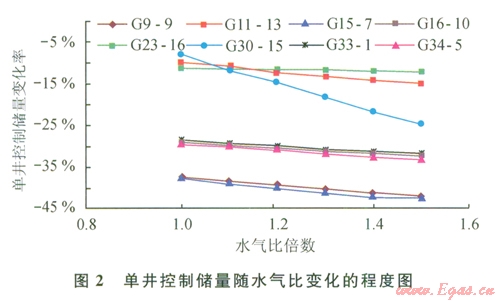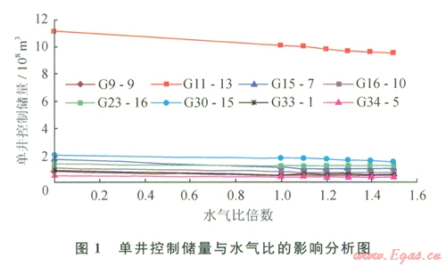 式中A、B、C、D、E、F分別為氣井氣相或水相的產(chǎn)能方程系數(shù),WGR為水氣體積比。通過該式就可求出氣井的控制儲量Go從上式可以看出:WGR越大,其單井控制儲量就越低。所以,控制好氣井的出水,就能提高氣井的產(chǎn)能,從而提高氣井對儲量的控制程度。