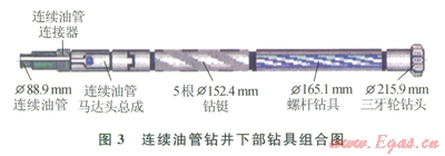 第二次開鉆進行連續(xù)油管鉆井試驗(圖3),Æ215.9mm鉆頭鉆達設計試驗井深350 m。主要鉆遇泥巖、頁巖和砂巖。鉆井參數:鉆壓為20~30kN,排量為18~20L/s,泵壓為3~5MPa。鉆井液參數:密度為1.05~1.15g/cm3,漏斗黏度為38~40s,API失水量為5mL,泥餅厚度為0.5mm。鉆具組合:Æ215.9mm鉆頭+Æ165.1mm螺桿鉆具+431×4A0接頭+5根Æl52.4mm鉆鋌+4A1×310接頭+Æ120.65mm馬達頭總成+Æ139.7mm連接器+Æ88.9mm連續(xù)油管。