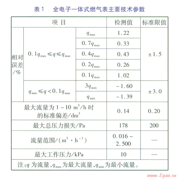 全電子一體式燃?xì)獗硗ㄟ^了無錫市計量測試中心對精確度、重復(fù)性、總壓力損失的檢測,取得了校準(zhǔn)證書。因目前沒有相應(yīng)的標(biāo)準(zhǔn),只能參照膜式燃?xì)獗淼臉?biāo)準(zhǔn),其技術(shù)指標(biāo)均達(dá)到GB/T6968-2011《膜式燃?xì)獗怼?span lang="EN-US">1.5級表的要求,主要技術(shù)參數(shù)見表l。