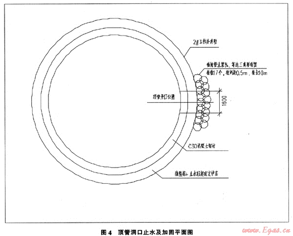 工作難點(diǎn):由于頂管洞口開(kāi)口部位位于細(xì)砂層中,若直接在井壁開(kāi)口將會(huì)有大量泥沙涌人作業(yè)井,引發(fā)地面塌陷。解決辦法:開(kāi)口前。在支護(hù)結(jié)構(gòu)外圍施工兩排注漿孔,共17孔,采用袖閥管注漿法加固洞口外圍砂層,止水防滲。加固結(jié)構(gòu)見(jiàn)圖4。開(kāi)口后洞口采用砌磚封門(mén)。