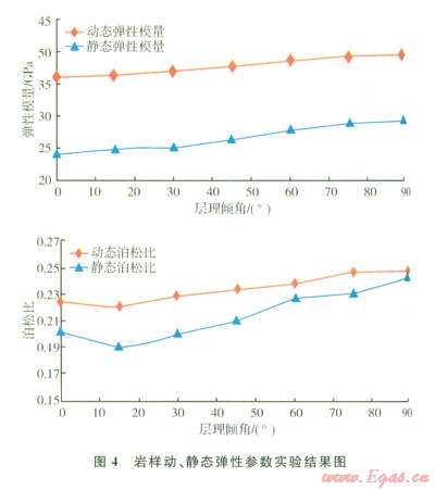 圖4為根據(jù)表2的實(shí)驗(yàn)結(jié)果得出的動(dòng)態(tài)彈性模量、泊松比和靜態(tài)彈性模量、泊松比隨層理傾角的變化圖。