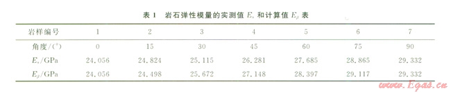 從表2可以看出,計(jì)算的彈性模量與實(shí)測(cè)值接近,最大誤差為3%。因此,只要對(duì)巖石作平行和垂直層理以及45°方向的3組樣品單軸壓縮實(shí)驗(yàn),就可用計(jì)算值來(lái)代替樣品的實(shí)測(cè)值,而不需要對(duì)每一個(gè)方向(β角)的樣品進(jìn)行單軸壓縮實(shí)驗(yàn)來(lái)確定模量,可省去大量樣品加工及實(shí)驗(yàn)工作。結(jié)果表明將層理巖石視為橫觀各向同性介質(zhì)來(lái)計(jì)算彈性模量是可行的。