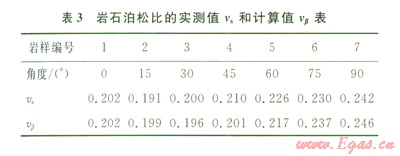 由表1的數(shù)據(jù)通過(guò)(12)計(jì)算泊松比隨角β的變化規(guī)律,泊松比的實(shí)測(cè)值和計(jì)算值結(jié)果數(shù)據(jù)見(jiàn)表3。