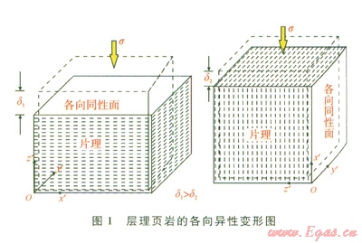 層理頁(yè)巖的各向異性變動(dòng)如圖l所示,垂直構(gòu)造面的壓縮性顯著大于平行構(gòu)造面的壓縮性,所以,這種巖石在層理面的應(yīng)力-應(yīng)變性狀是各向同性的。