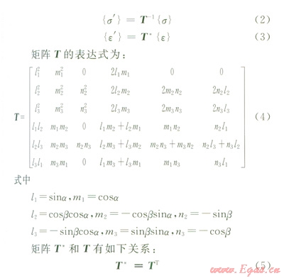 借助轉(zhuǎn)換矩陣T和T*,把總體坐標(biāo)系中的應(yīng)力{σ}和應(yīng)變{ε}分別換算為局部坐標(biāo)系中的應(yīng)力{σ'}和應(yīng)變{ε'}。