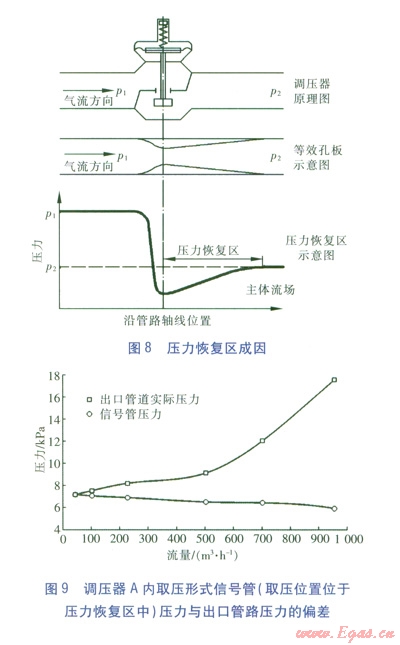 ②壓力恢復(fù)區(qū)內(nèi)的壓力低于調(diào)壓器的實(shí)際出口壓力。信號(hào)管在壓力恢復(fù)區(qū)中不同位置的取壓值不同:取壓值隨信號(hào)管取壓位置逐漸脫離壓力恢復(fù)區(qū)而逐漸趨近于調(diào)壓器的實(shí)際出口壓力。