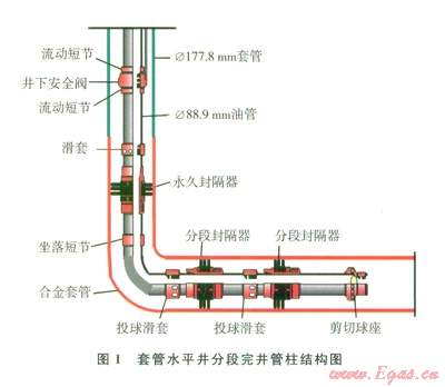 套管完井水平井,采用一趟下入完井管柱,管柱結(jié)構(gòu)見圖l。