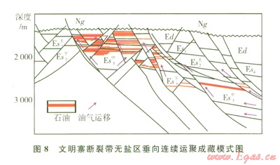 該成藏模式主要分布于無鹽巖發(fā)育的復(fù)雜斷裂帶,屬于常壓環(huán)境油氣藏的油氣成藏模式類型。這種模式油氣藏的油氣主要是在浮力作用下沿斷裂向上連續(xù)運移。以文明寨地區(qū)為代表(圖8)。該成藏模式具有如下特點:①具有沙三上、中、下亞段3套烴源巖供烴;②以垂向連續(xù)運移為主,側(cè)向運移為輔;③圈閉類型主要為斷塊圈閉;④運移動力主要是浮力;⑤縱向上烴類聚集層系沿主干斷裂呈羽狀分布。
