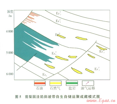 洼陷內(nèi)部發(fā)育的濁積、灘砂或灘壩等透鏡體狀砂巖儲集體“近水樓臺先得月”,通過近距離運移,優(yōu)先捕捉油氣,并在巖性圈閉中聚集成藏,以前梨園洼陷為代表(圖5)。該成藏模式具有如下特點:①烴源巖供烴層系單一,為巖性圈閉所在生烴層系;②巖性圈閉以封閉透鏡式為主;③生烴、構(gòu)造運動及差異壓實為巖性圈閉充注油氣提供了動力。