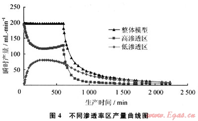2) 開采初期,以高滲透區(qū)供氣為主,高滲透區(qū)產(chǎn)量遠大于低滲透區(qū)產(chǎn)量;開采后期即穩(wěn)產(chǎn)期結(jié)束后,高滲透區(qū)產(chǎn)量遞減很快,而低滲透區(qū)產(chǎn)量遞減比較緩慢,且低滲透區(qū)產(chǎn)量貢獻率逐漸增大,即生產(chǎn)后期小產(chǎn)量生產(chǎn)時以低滲透區(qū)供氣為主(圖4)。低滲透區(qū)滲透率越高,則產(chǎn)量貢獻率越大。