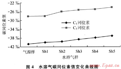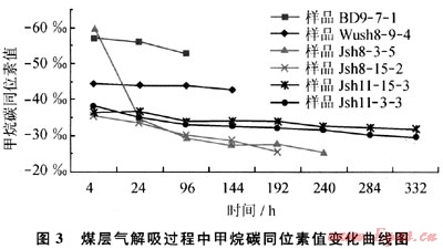 2) 通過甲烷在解吸吸附過程中碳同位素的分餾效應(yīng),可以判斷煤層氣成藏過程。在煤層氣開發(fā)過程中,可以建立某一區(qū)塊煤層氣開發(fā)井的甲烷碳同位素值的標準變化曲線,從而根據(jù)開發(fā)井甲烷碳同位素的值來判斷煤層氣井的開發(fā)狀態(tài)及采收率。