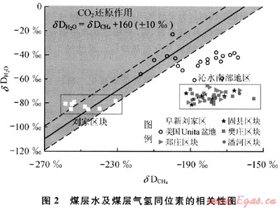 煤層水及煤層氣氫同位素的相關(guān)性表明:阜新劉家地區(qū)煤層生物成因氣偏向C02還原作用,沁水盆地南部煤層生物成因氣偏向發(fā)酵作用(圖2,分析中采用國際標準物質(zhì)VSMOW):