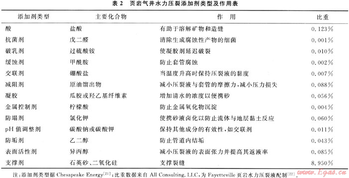 無(wú)論是在頁(yè)巖氣開(kāi)發(fā),還是在常規(guī)油氣開(kāi)發(fā)的壓裂過(guò)程中,壓裂液及其性能都是影響壓裂最終效果的重要因素。壓裂液及其性能對(duì)能否造出一條足夠尺寸的、有足夠?qū)Я髂芰Φ牧芽p有直接關(guān)系。清水壓裂液組成以水和砂為主,含量占總量的99%以上,其他添加劑成分占?jí)毫岩嚎偭康牟蛔?%。添加劑在壓裂液中所占的比例很小,但對(duì)提高頁(yè)巖氣井的產(chǎn)量說(shuō)卻是至關(guān)重要。頁(yè)巖水力壓裂常見(jiàn)添加劑類(lèi)型及其作用見(jiàn)表2。