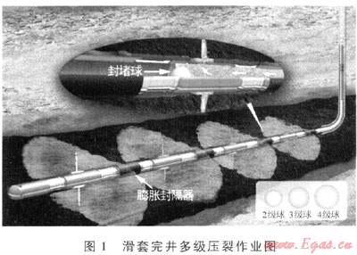 多級(jí)壓裂的特點(diǎn)是多段壓裂和分段壓裂,它可以在同一口井中對(duì)不同的產(chǎn)層進(jìn)行單獨(dú)壓裂。多級(jí)壓裂增產(chǎn)效率高,技術(shù)成熟,適用于產(chǎn)層較多,水平井段較長(zhǎng)的井(圖1)。頁(yè)巖儲(chǔ)層不同層位含氣性差異大,多級(jí)壓裂能夠充分利用儲(chǔ)層的含氣性特點(diǎn)使壓裂層位最優(yōu)化。在常規(guī)油氣開(kāi)發(fā)中,多級(jí)壓裂已經(jīng)是一個(gè)成熟的技術(shù),國(guó)內(nèi)有很多成功應(yīng)用的實(shí)例。多級(jí)壓裂技術(shù)用于我國(guó)的頁(yè)巖氣開(kāi)發(fā)有一定的技術(shù)基礎(chǔ),是可行的壓裂技術(shù)。