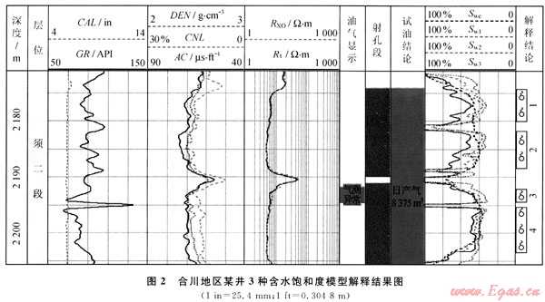 研究區(qū)巖性較細(xì),黏土以分散形式分布于地層中,Simandoux公式的推導(dǎo)是不考慮黏土或泥質(zhì)具體分布形式,并假設(shè)泥質(zhì)與純砂巖一樣含有油、氣、水,這與實(shí)際更相符。這樣處理將會共同校正泥質(zhì)含量和砂巖電阻率變化的影響,能夠消除因砂巖儲層物性差、孔喉結(jié)構(gòu)復(fù)雜和地層水礦化度高等因素帶來的影響。計算過程中,Simandoux公式也沒有用到研究區(qū)變化范圍較大的巖電參數(shù)b、m,減小了人為干預(yù)。因此,用Simandoux公式對研究區(qū)砂泥巖油氣層進(jìn)行含水飽和度處理是合乎情理的,實(shí)際應(yīng)用證明,處理結(jié)果更符合實(shí)際。
