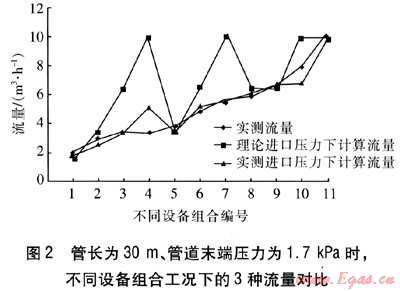 表3 管道末端壓力為1.7kPa時,不同管道系統(tǒng)的理論進口壓力下計算流量 m3/h