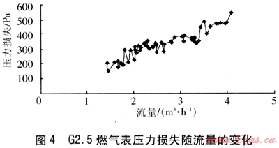 ③ 燃氣表的壓力損失普遍超出廠家提供的值,部分型號甚至超出了國家檢定規(guī)程的要求。燃氣表在接近最大流量時,壓力損失增加幅度更大,尤其是G2.5膜式表,在流量為4.08m3/h時,壓力損失已達542Pa。故燃氣表的選型不應(yīng)只考慮量程范圍,還應(yīng)考慮量程范圍內(nèi)的壓力損失是否符合規(guī)范要求,以及大流量區(qū)間壓力損失增加幅度更大等因素。