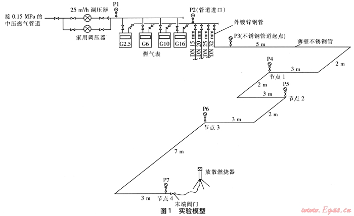 實驗?zāi)P鸵妶D1。根據(jù)低壓燃氣管道的流量計算公式可知,當管徑一定時,管道中的燃氣流量只與計算起點、終點間的壓力降有關(guān),與計算終點之后管道內(nèi)的壓力變化情況無關(guān)。