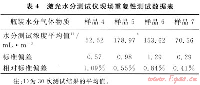 在A、B輸氣點站安裝SS2000激光水分測試儀,運行6個月后,采用中國測試技術研究院制備的4瓶瓶裝水分氣體物質(補充氣分別為氮氣和甲烷),對儀器的重復性進行了考察。實驗結果見表4。