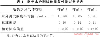 重復性是儀器的重要技術指標,直接影響分析結果的不確定度。在實驗室對儀器的重復性進行了考察。測試對象為中國測試技術研究院制備的3瓶瓶裝水分氣體物質(補充氣為氮氣),用SS2000激光水分測試儀對每瓶氣體進行了連續(xù)1h的測試,測試結果見表1。