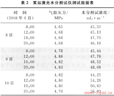SS2 000激光水分測試儀在某輸氣站運行了4個月,對站場進氣進行實時監(jiān)測,于每天8:00、12:O0、16:00和20:O0分別記錄儀器的測試數(shù)據(jù),2008年6月8~10日的測試結果見表2。