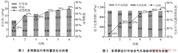 可動用庫存量逐漸增加,不可動用庫存量總體略有降低,庫存的動用程度隨之增加,其變化示意圖見圖2。經(jīng)過6個(gè)周期后,可動用庫存量由2.85×108m3增至11.63×108m3,增加了3.1倍;不可動用庫存量由8.62×108m3降至8.32×108m3,降幅為3.5%;庫存動用程度從25%增至58%,提高了1.3倍,但目前仍有42%庫存不可動用。