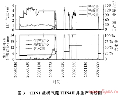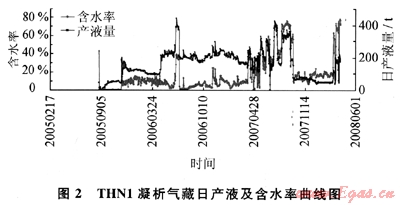 THN1凝析氣藏的生產(chǎn)動態(tài)資料顯示,2007年7月開始排液采氣時,排液井僅2口——THN2、THN4H井,且排液僅15d(7月12~27日)后即關(guān)井,至8月12日又才開井排液。排液井?dāng)?shù)少、排液時間短,在短時間內(nèi)不能完全阻止已推進氣藏內(nèi)部的邊水繼續(xù)向前推進,導(dǎo)致內(nèi)部氣井,甚至一線井都不見效。