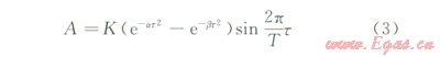 式中A為子波的瞬時(shí)(t)振幅,K為單元子波的振幅倍數(shù),對于反射子波,如果入射子波為一個(gè)單元子波,那么K就是反射系數(shù),這時(shí)K是一個(gè)分?jǐn)?shù),T是振蕩的主周期,(e-at2-e-bt2)為子波包絡(luò),其中t是從包絡(luò)起點(diǎn)t0開始計(jì)算的時(shí)間,t0可以是從激發(fā)開始計(jì)算的時(shí)間,也就是記錄上的波至?xí)r間,子波包絡(luò)還可以寫成: