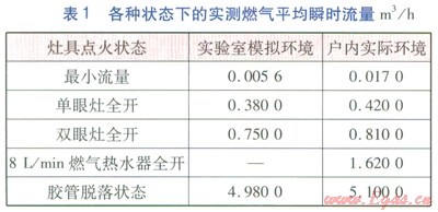 基表型號(hào)為Gl.6,氣源為天然氣,壓力為3000Pa,燃具在各種狀態(tài)下測定的瞬時(shí)流量經(jīng)整理后的平均值見表1。