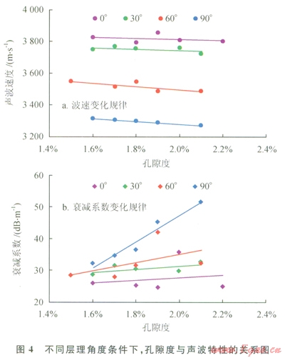2)波速與孔隙度呈現(xiàn)較好的負(fù)相關(guān)性,隨孔隙度增加,衰減系數(shù)增加,且增加程度隨層理角度的變大而加劇。
