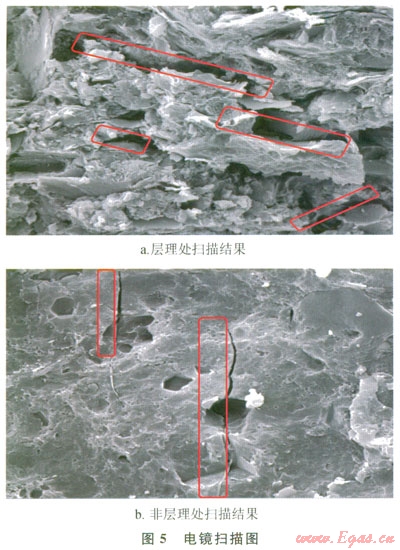 頁巖的層理發(fā)育方向是研究和表征層理最重要的參數(shù)之一。對頁巖進行電鏡掃描(圖5)可知,層理面處的膠結(jié)物較多,黏土礦物的產(chǎn)狀相對比較混亂,且相對非層理處的微裂縫更加發(fā)育,可知層理面的存存減小了波速,增加了衰減。因此,圖4-a中出現(xiàn)了波速在層理為90°時要遠(yuǎn)小于層理為0°時的情況。層理角度變大、衰減增加是由于角度越大,聲波穿透的層理數(shù)增加所致,孔隙度增加層理面的微裂縫數(shù)也會增加,因此出現(xiàn)圖4-b所示的增加規(guī)律。利用上述規(guī)律,可以綜合利用聲波資料進行儲層評價,對層理角度進行預(yù)測。